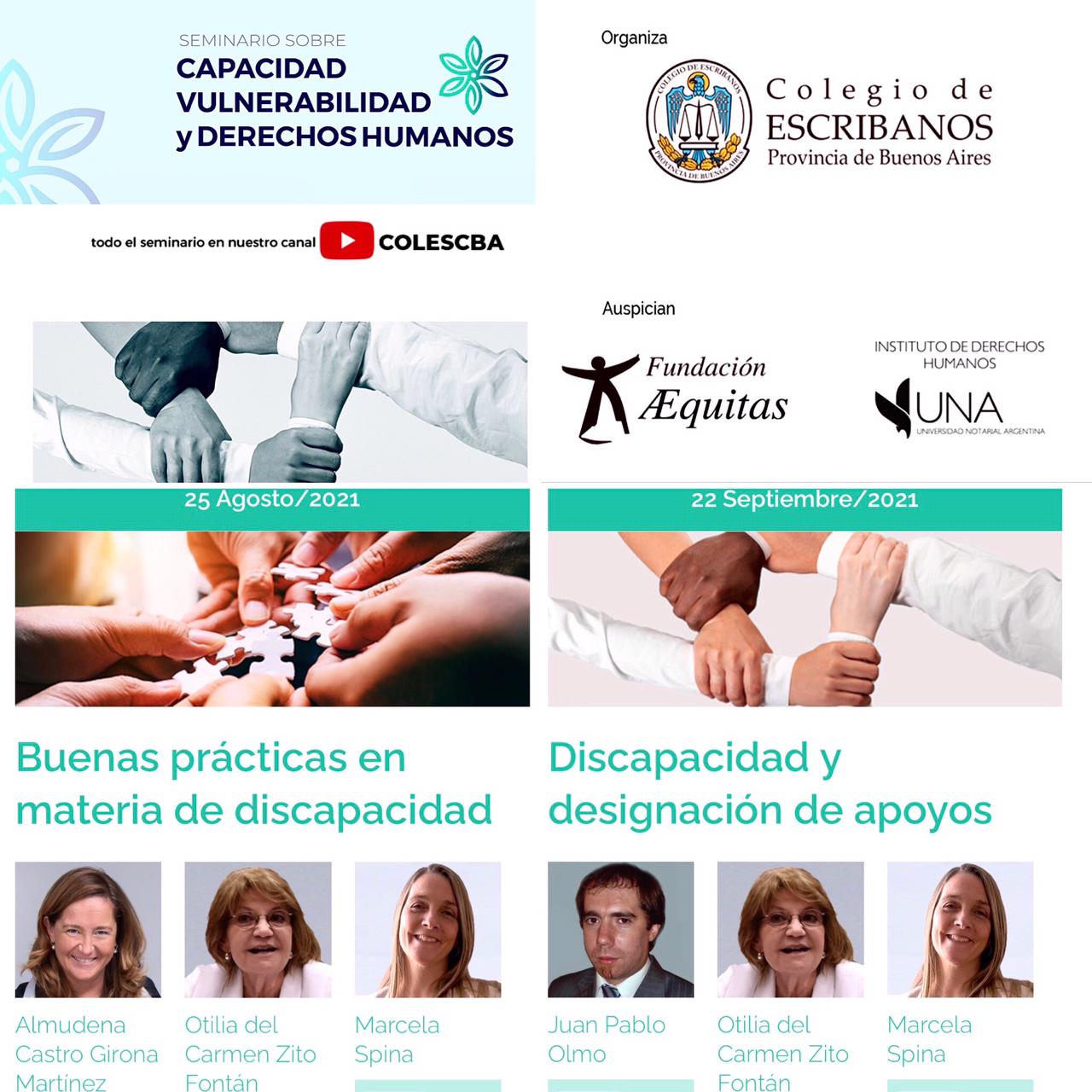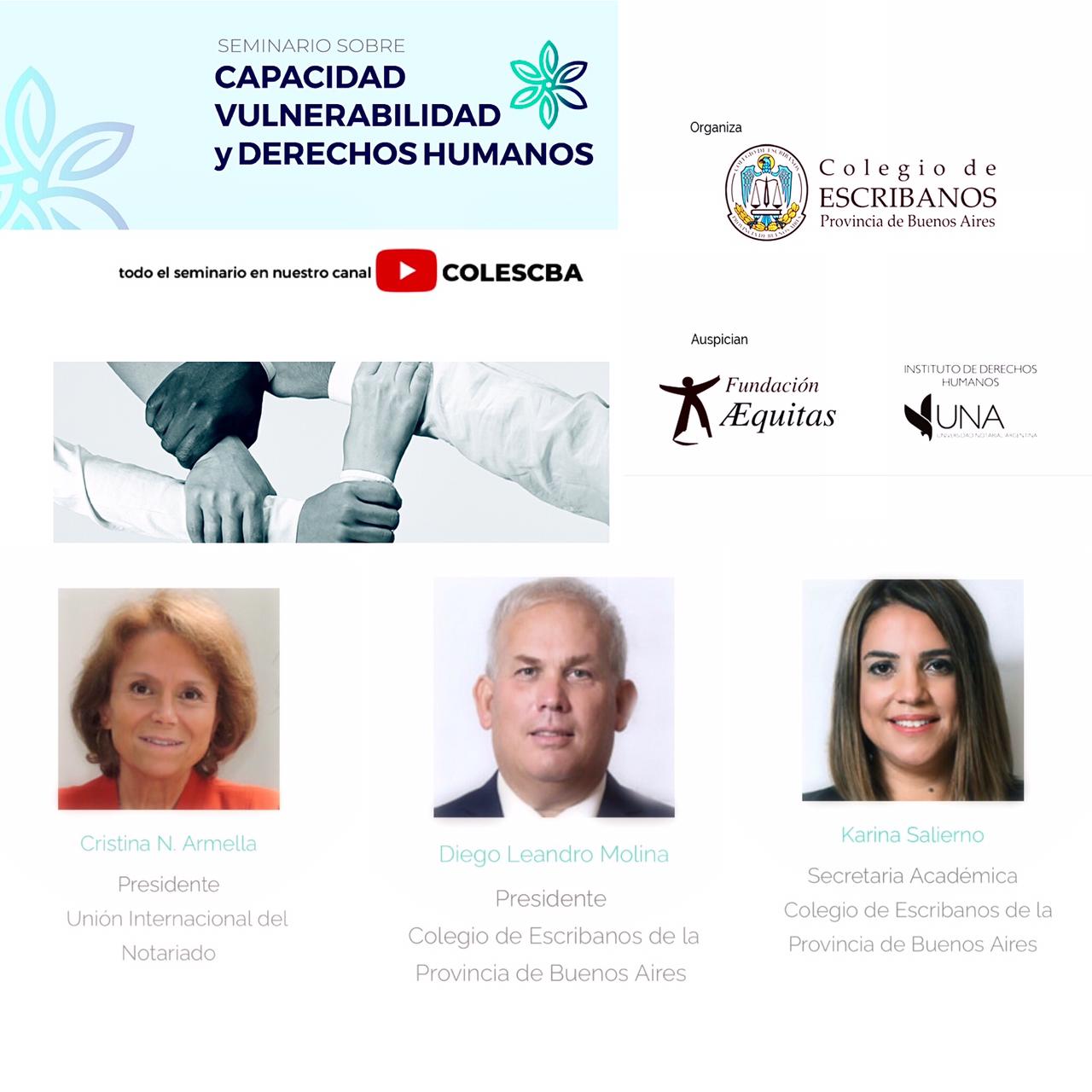 El 25 de agosto a las 19 hs, antes del comienzo del primer módulo dedicado al tema «Buenas prácticas en materia de discapacidad», se producirá la apertura de este Seminario, con la presencia de la Presidente de la Unión Internacional del Notariado (UINL), Cristina N. Armella, el Presidente del Colegio de Escribanos, Diego Leandro Molina, y su Secretaria Académica, Karina Salierno.
